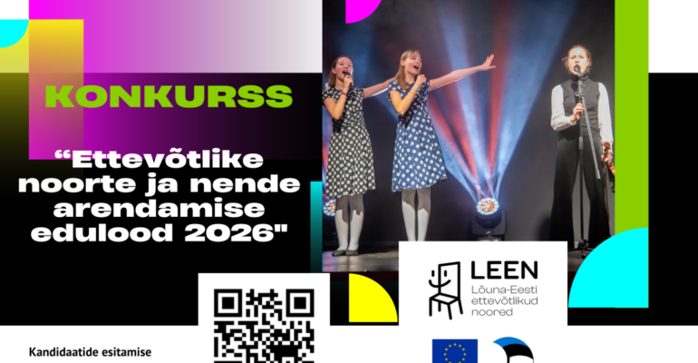 LEEN on noortele mõeldud kasvulava, kus sinu ettevõtlikkus saab tiivad! Koostööprojekt “Lõuna-Eesti ettevõtlikud noored” loob noortele võimalusi 6 maakonnas: Tartu, Jõgeva, Põlva, Valga, Viljandi ja Võru maakonnas.
